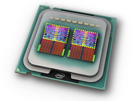 - A imagem abaixo exibe uma montagem que ilustra o interior de um processador Intel Core 2 Extreme Quad Core (núcleos destacado na cor amarela);